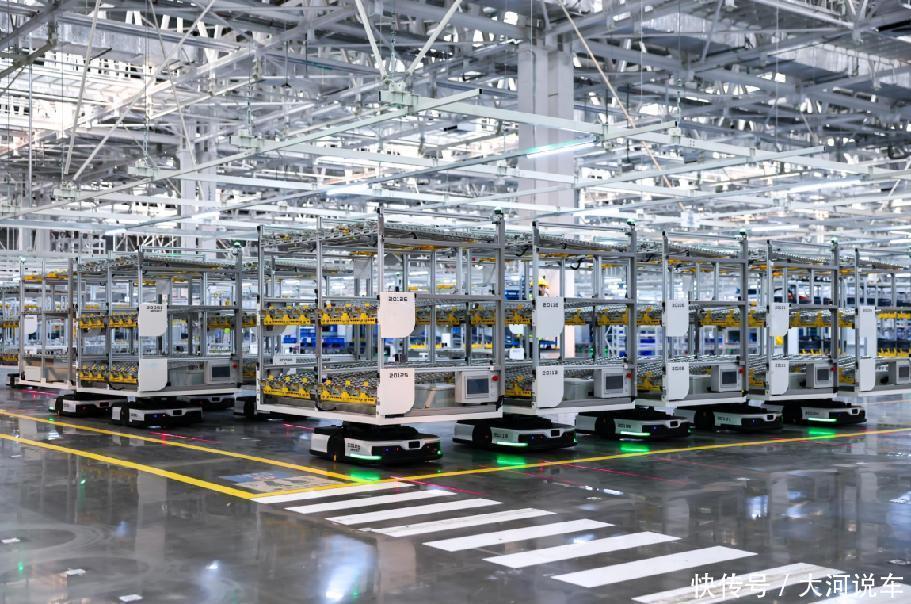 涂装车间采用行业先进的定量机和喷枪系统实现100%全车自动涂胶,结合视觉定位系统,打胶精度达到0.5mm;总装车间整体自动化率达到国内汽车行业水平近3倍,导入零件自动配送AGV及直供输送线(下图),实现物流效率提升25%。