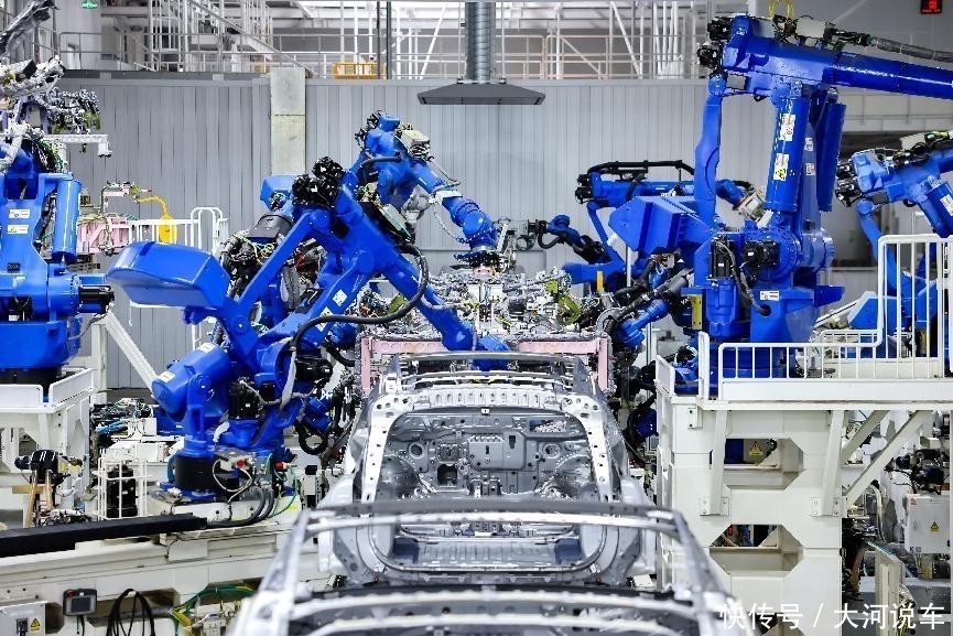 数智化层面,广汽本田开发区新能源工厂通过数字化与智能科技的深度整合,实现全链路数据贯通和智能高效柔性生产:通过MES系统与设备监控系统的100%数据连接提升生产计划与实绩联动响应速度;冲压车间采用全伺服生产线,最快3.75秒生产一个/一对冲压零件,零件生产完成后由机器人完成100%自动装箱;焊装车间实现焊接100%自动化(下图),应用行业首创的焊接AI检测,确保车身焊点100%合格。